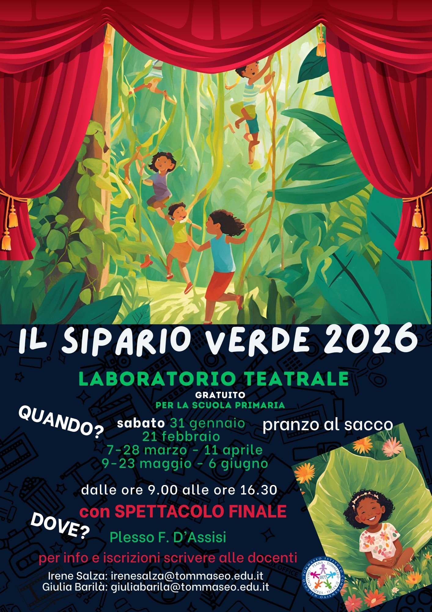 In attuazione del Programma Nazionale “Scuola e competenze” 2021-2027, prende il via Il Sipario Verde 2026, un laboratorio teatrale gratuito dedicato alle alunne e agli alunni della scuola primaria, pensato per promuovere espressività, collaborazione, creatività e benessere attraverso il linguaggio del teatro e il contatto con l’ambiente.