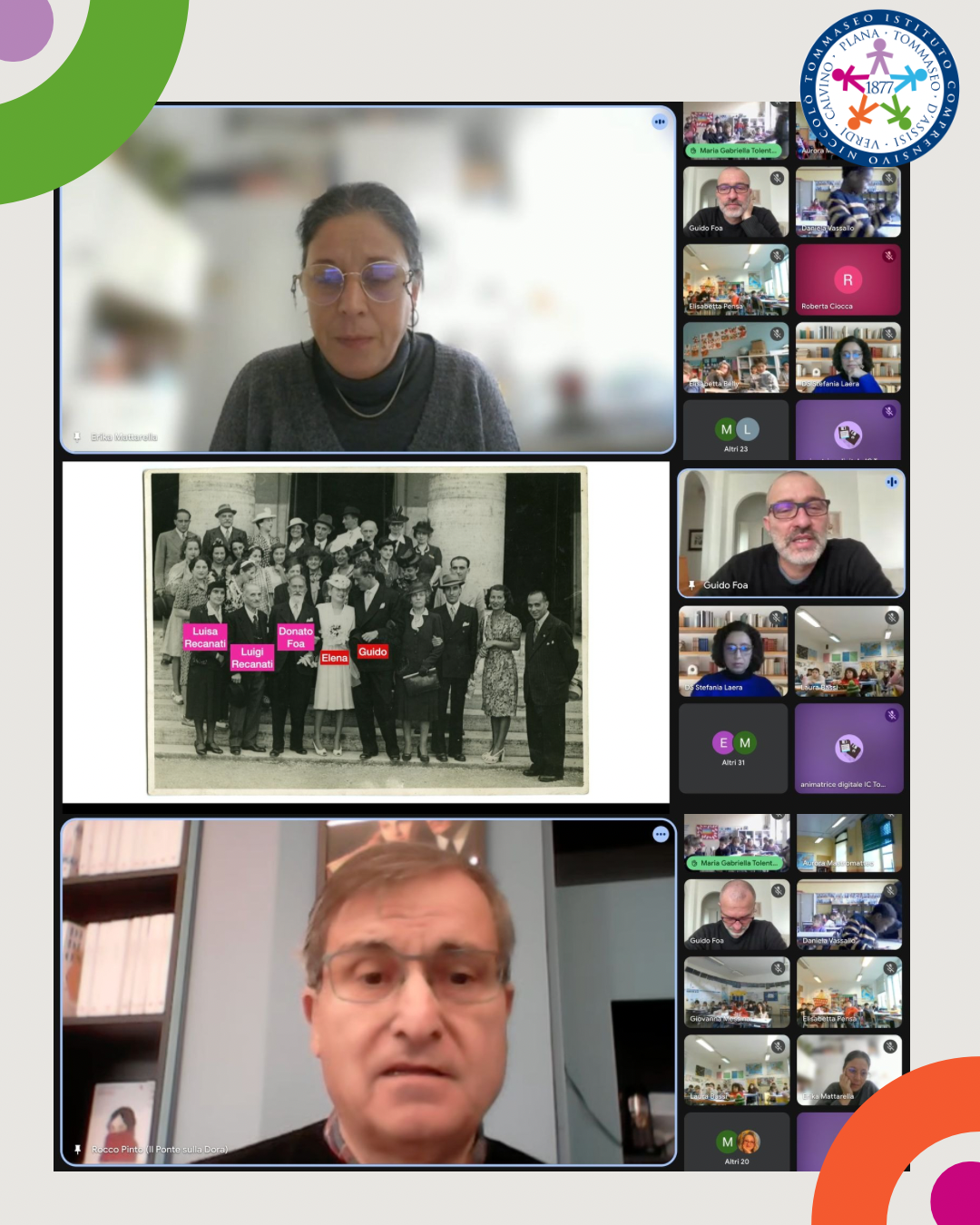 A seguire, tutti in collegamento online con la dirigente scolastica Stefania Laera e gli ospiti speciali: Guido Foa che ha portato la testimonianza sull'esperienza della sua famiglia deportata ad Auschwitz; Erika Mattarella, direttrice dei Bagni Pubblici di via Agliè, che ha parlato delle discriminazioni durante il periodo nazifascista e ha letto il testo tratto del sermone del pastore luterano Martin Niemöller Un giorno vennero; il libraio Rocco Pinto de Il ponte sulla Dora che ha suggerito alcune letture e ha concluso il suo intervento lasciando a tutti la poesia Anna Frank di Bruno Tognolini.